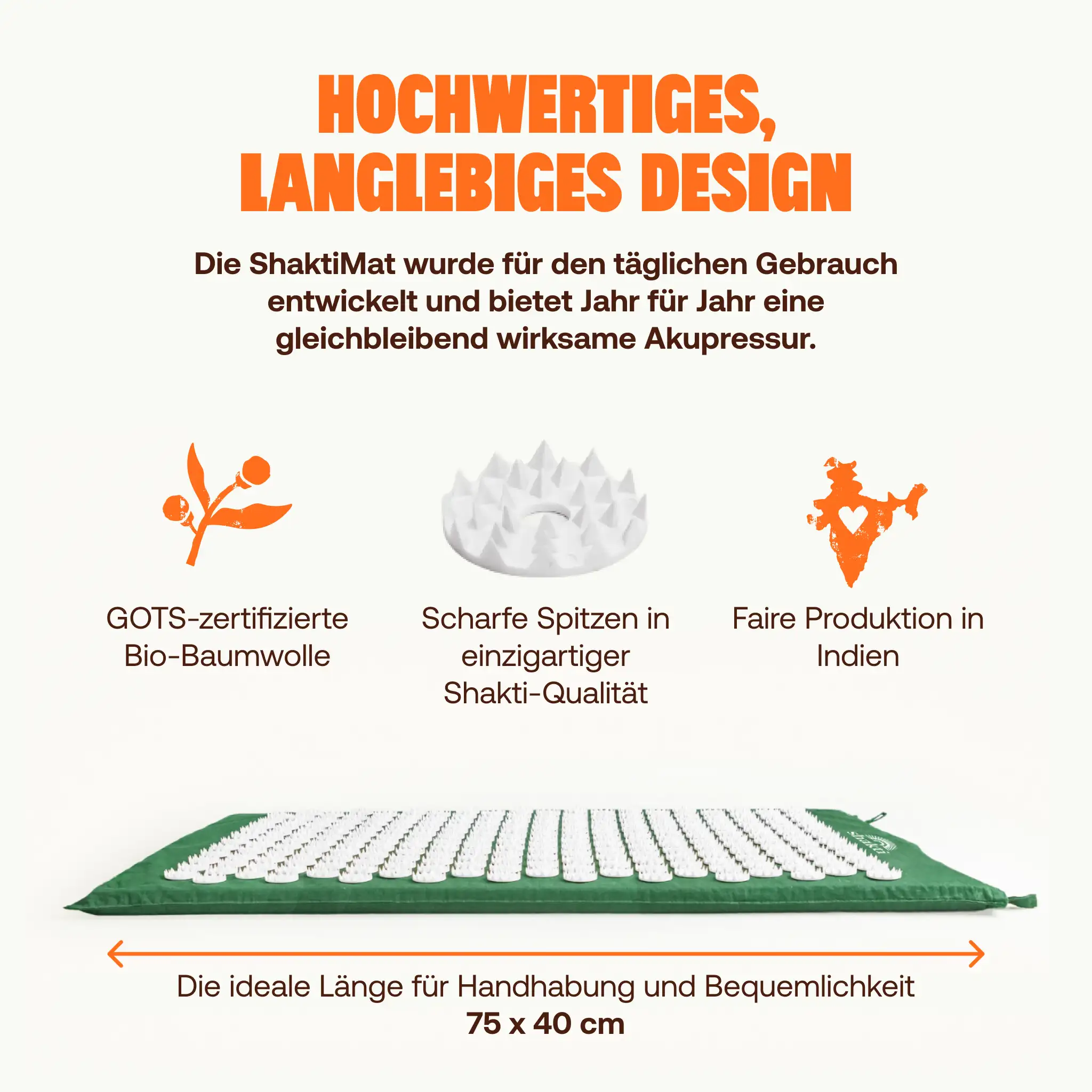 Das Geheimnis sind die scharfen Spikes aus medizinischem ABS-Kunststoff und ihre clevere Anordnung. Mit 6.210 Spitzen bietet dir die Shakti Mat Original eine mittlere Intensität, die für 95 % der Anwender:innen geeignet ist.