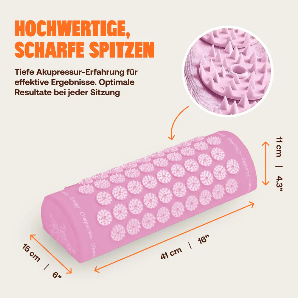 Das 40 x 15 x 10 cm große Kissen ist mit 66 runden Clip-Disks ausgestattet, die jeweils 27 ABS-Kunststoffspitzen enthalten. Das ist die Power von 1.800 Akupressur-Spitzen für dein Wohlbefinden. Leg das Kissen sanft unter deinen Nacken und genieß die Entspannung - sei es beim Fernsehabend, vor dem Einschlafen oder während eines kurzen, regenerierenden Nickerchens.