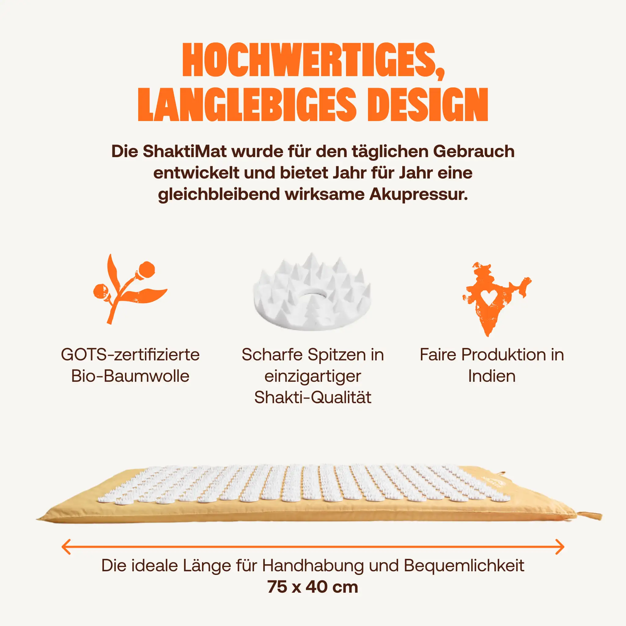 Das Geheimnis sind unsere Signature-Spikes aus ABS-Kunststoff. Genauso hart und spitz wie bei der Original-Matte - der Druck wird durch die höhere Anzahl aber sanfter verteilt. So bietet die Shakti Mat Light eine milde Intensität, die für Akupressur-Neulinge und schmerzempfindliche, sensible Menschen geeignet ist.
